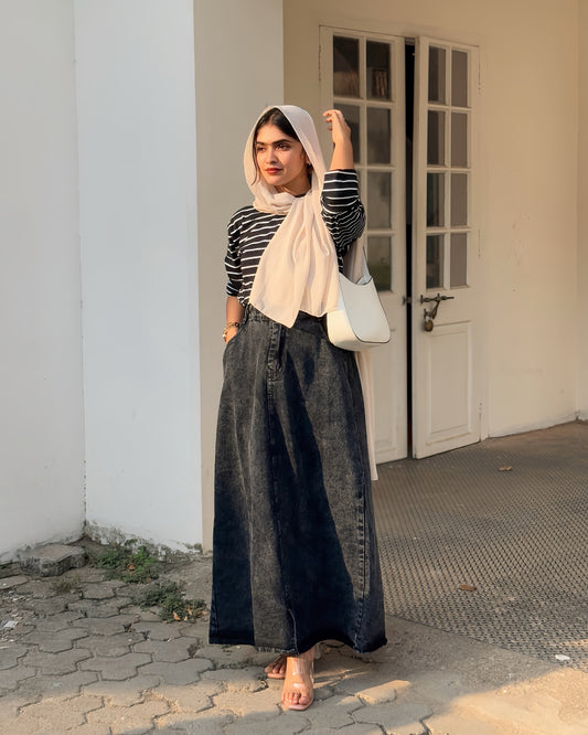 Stripes top and denim skirt